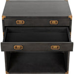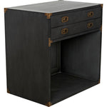 From the Campaign collection of fine furniture, this solid mahogany side table is distinguished by brass hardware and slim sawhorse legs. Three drawers add handy hidden storage, and its hand-applied pale finish allows the hardwood to glow.