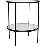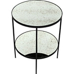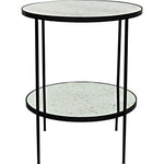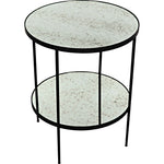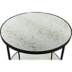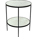 Two rounds of antiqued mirror glass are held aloft by slim bands of metal, elevating the uncomplicated lines of this effortless accent table.
