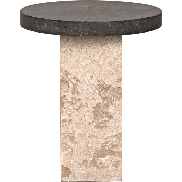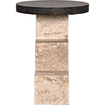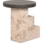 The Barnes Side Table is constructed of solid marble in a Postmodern inspired step design. "Stairs" in cream tone marble are topped by a circular slab of dark gray marble. Natural marble is unique to each piece. Indoor use only.