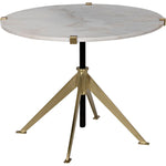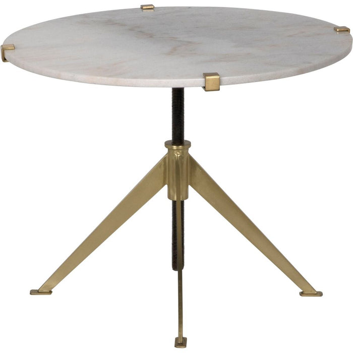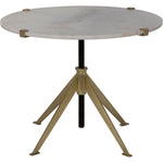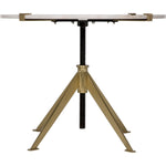An updated take on mid-century modern, this table is topped with a slab of genuine quartz and designed to embrace the beauty of the natural material. The one of a kind stone discs top minimally finished adjustable metal bases that allow the table's height to be easily adjusted.