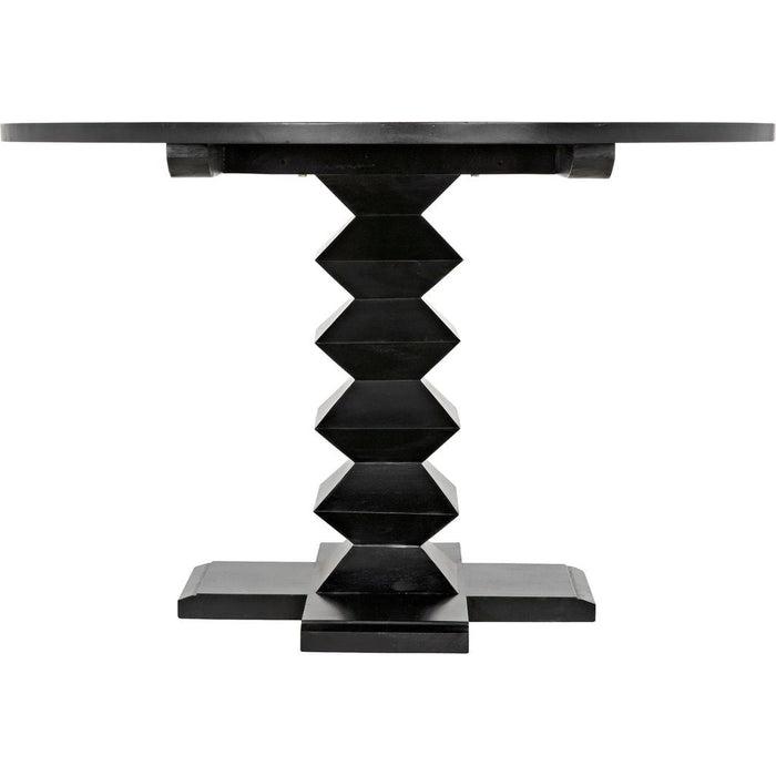 Handcrafted of pale or hand rubbed black mahogany, this dining collection is defined by the refinement of its table legs. The distinct effect is created by our artisans who showcase the science of beauty by utilizing unique geometric shapes to achieve the unique Zig Zag look.