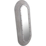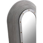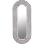 This full-length wall mahogany mirror features a substantial racetrack frame embellished with repeating rings of hand-carved grooves. Brass nailhead accents accent the inner portion of the frame. An intriguing blend of styles, you can see both industrial and coastal inspirations in the design.