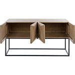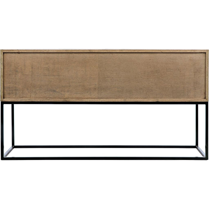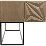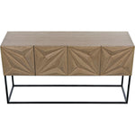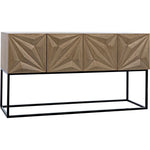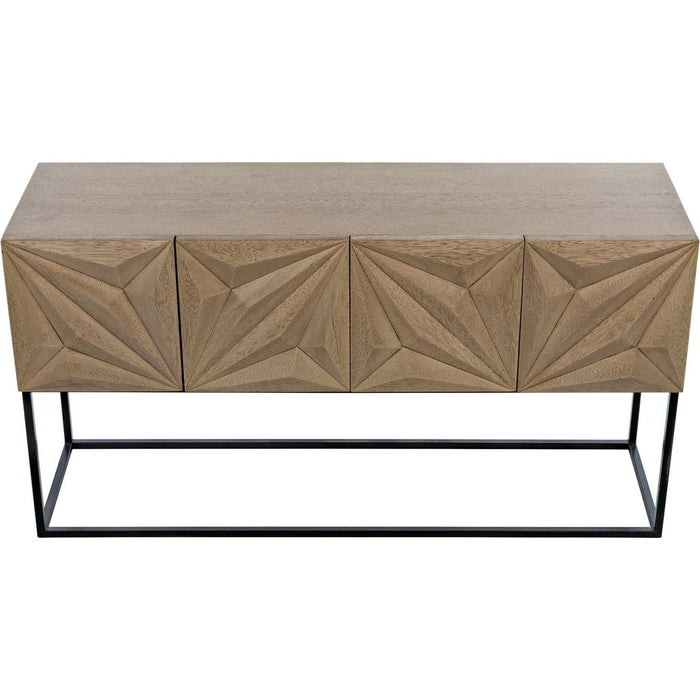 Stunning in its simplicity, this solid walnut sideboard rests atop slim metal legs. Each of its four doors is beautifully hand-carved with bold diamond and rhombus patterns. Open, they reveal generous interior storage. Simplicity, perfectly rendered.
